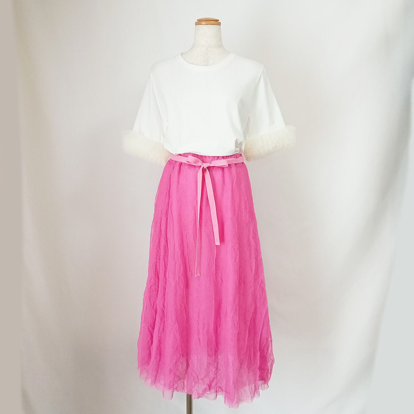 L'acqua のウェストはゴム仕立てでリボンベルト付きチュールスカートは、夏の暑い日でも涼しく快適に過ごせる一枚です。季節関係なく一年中着用できるチュール特有の透け感がある風合いとシンプルなデザインで、どんなシーンでも活躍してくれます。軽やかな着心地で、さりげないおしゃれを楽しめるのが魅力です。