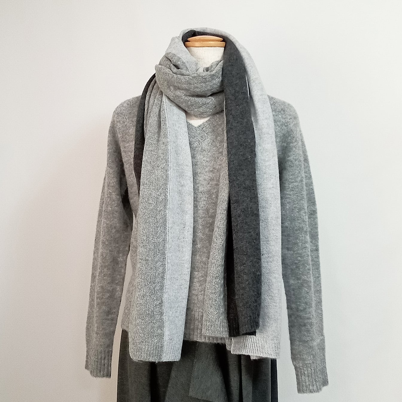 このカシミヤ大判ストールは、グラデーションカラーと部分的に編地を変えて、表情のあるストールなのでシンプルな服装にもコーディネートし易いです。