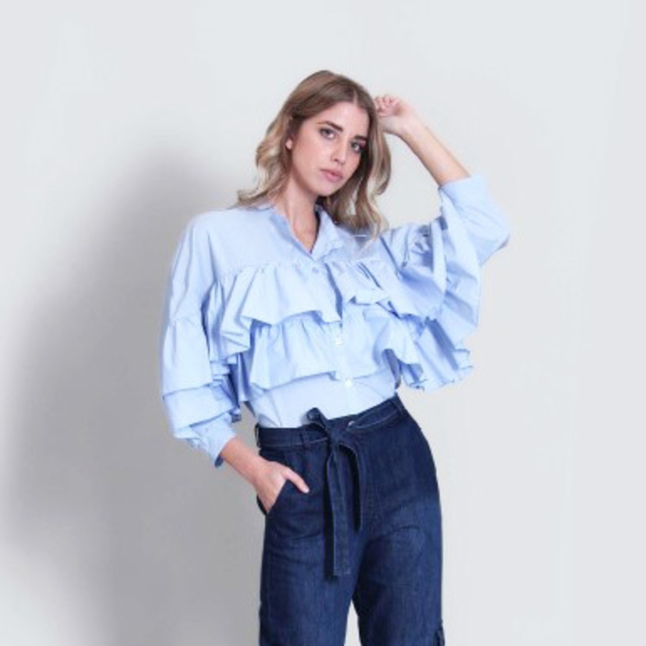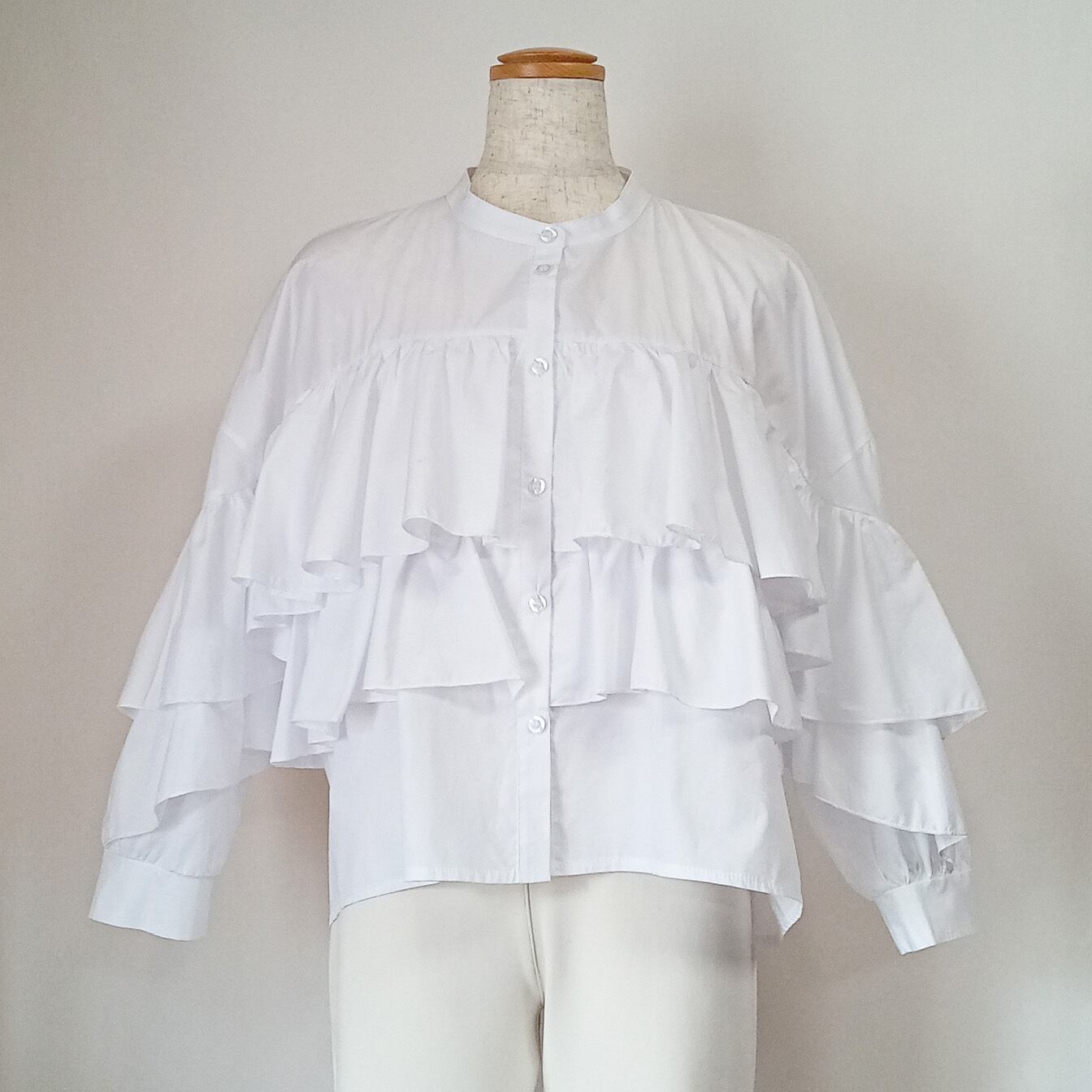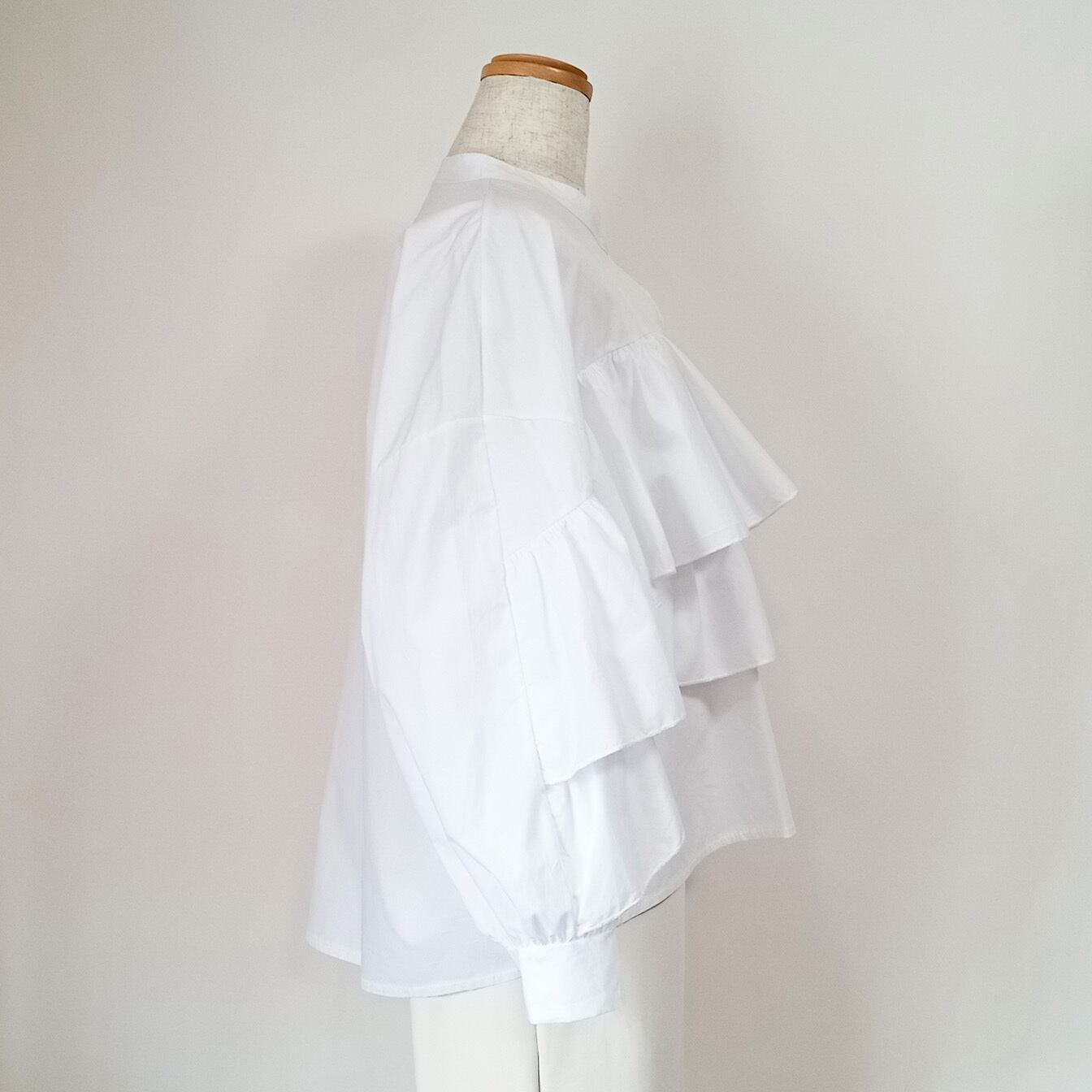 イタリア・レストレーゲのブラウスは、最旬ブラウスの中でも大胆なボリュームフォルムに仕上げています。さらっとしたコットン素材なので着心地も良く、2段フリルが可愛過ぎずに大人のフリルをご提案しています。着易いです。