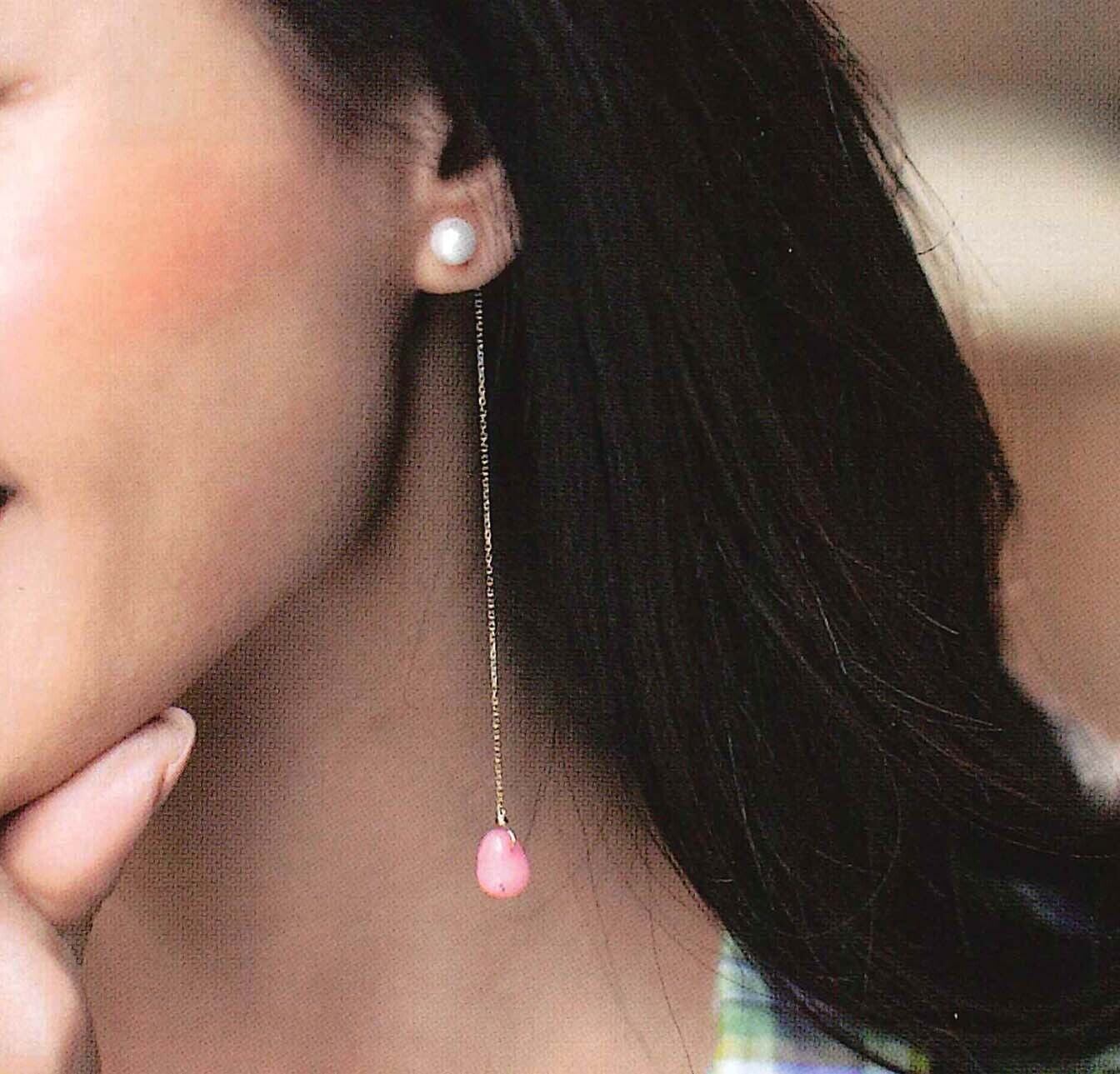 チャッチはパールなので、写真のように貝パールを前にして長く垂らせば、より一層個性的な雰囲気になります。